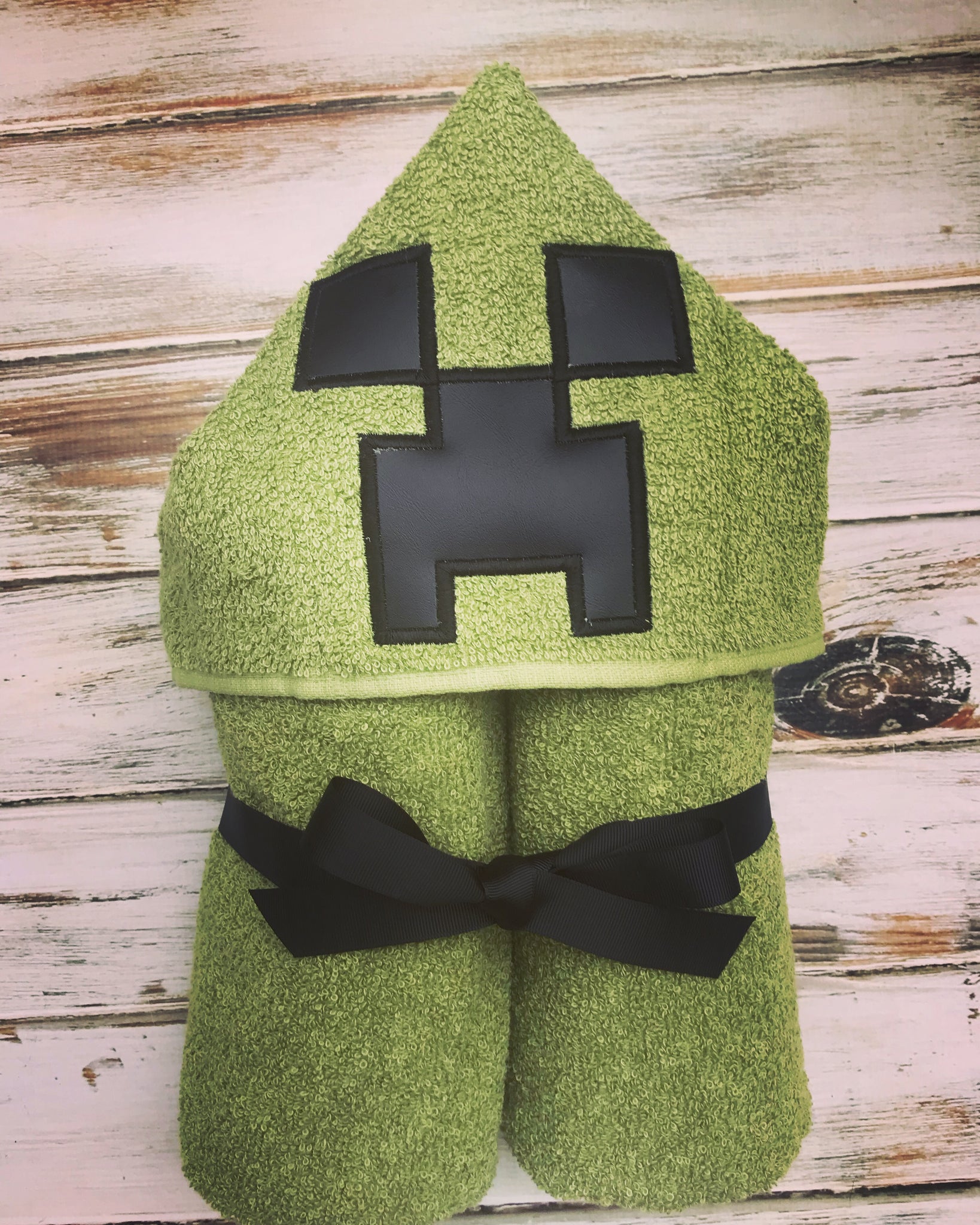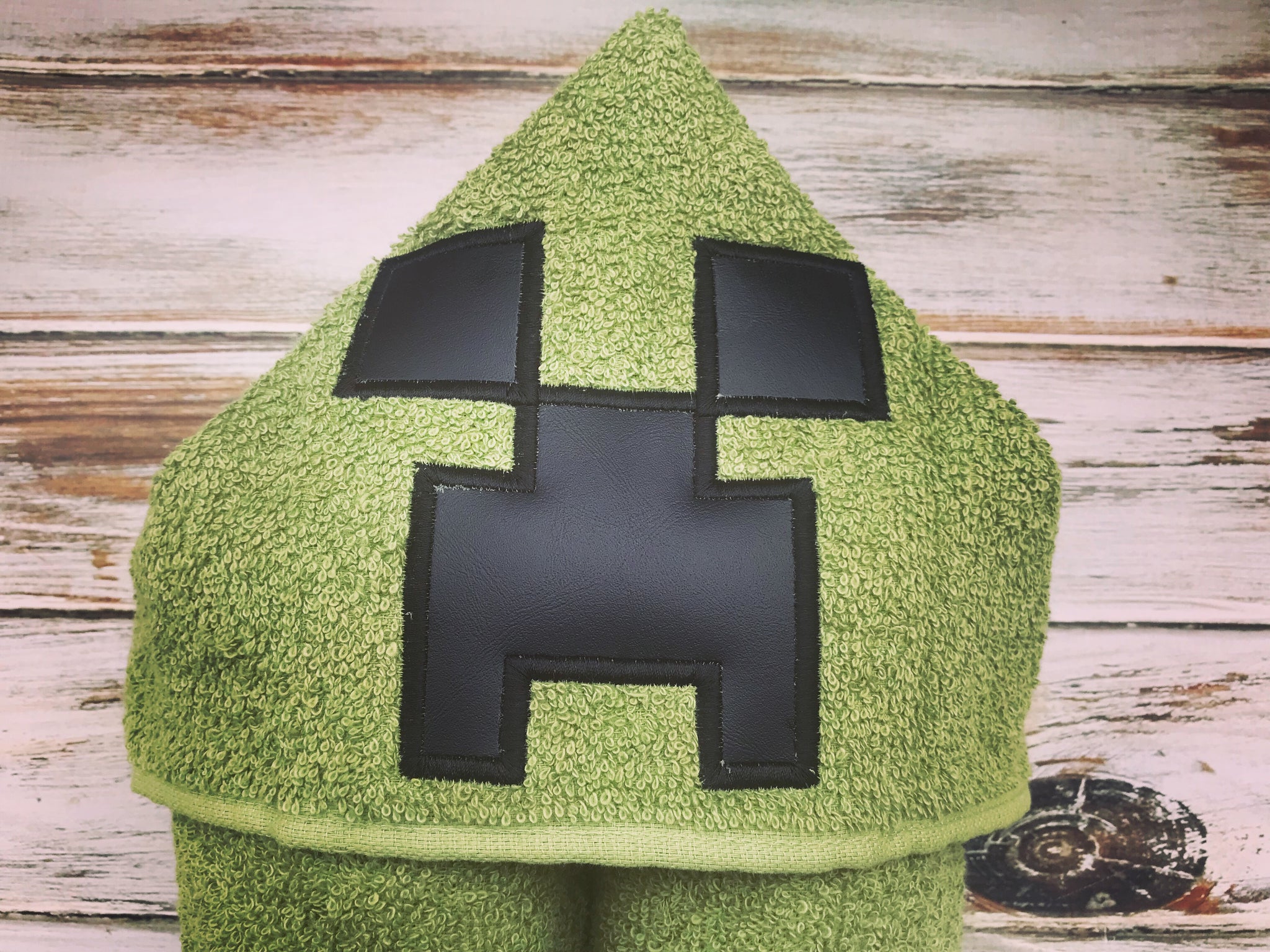 This listing is for a custom Creeper Minecraft hooded towel. Price includes child's name on the back of the towel.