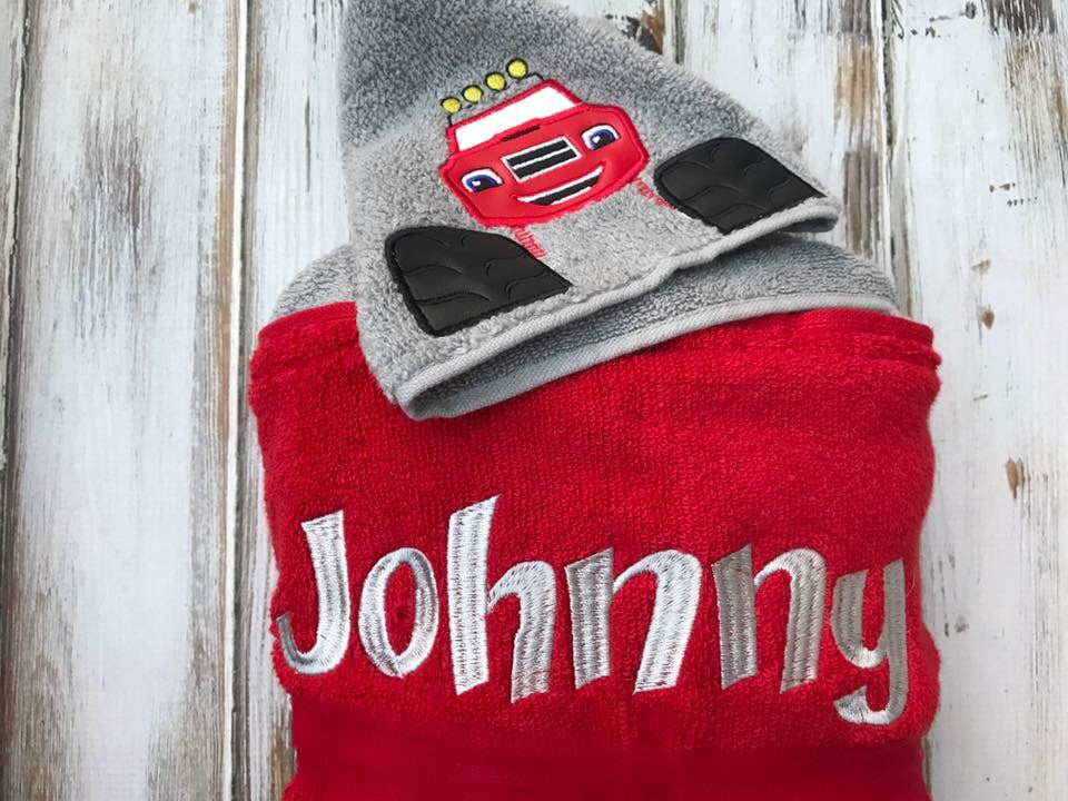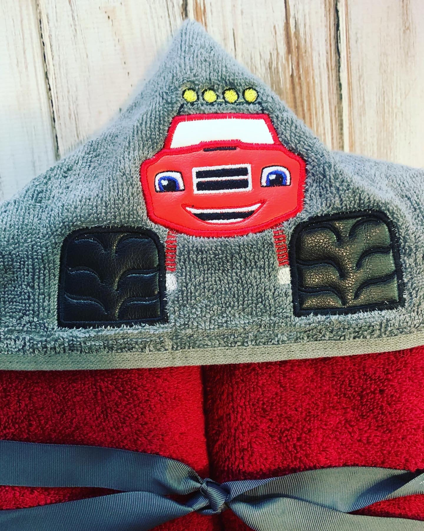 This listing is for a custom Monster Truck Blaze hooded towel. Price includes child's name on the back of the towel.