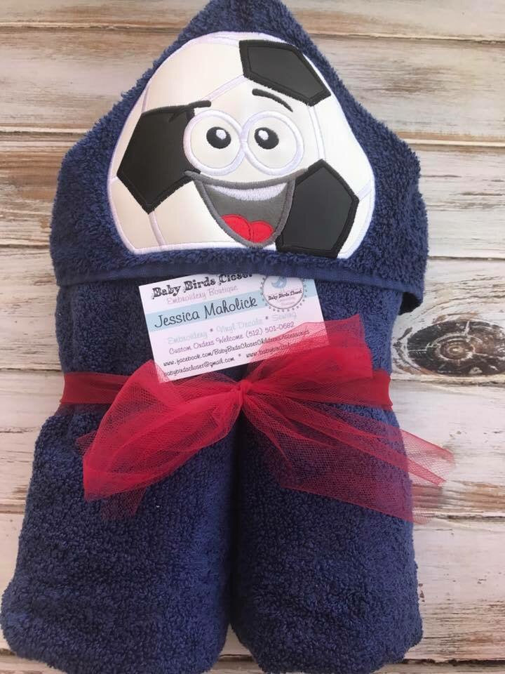 This listing is for a custom Soccer ball hooded towel. Price includes child's name on the back of the towel.