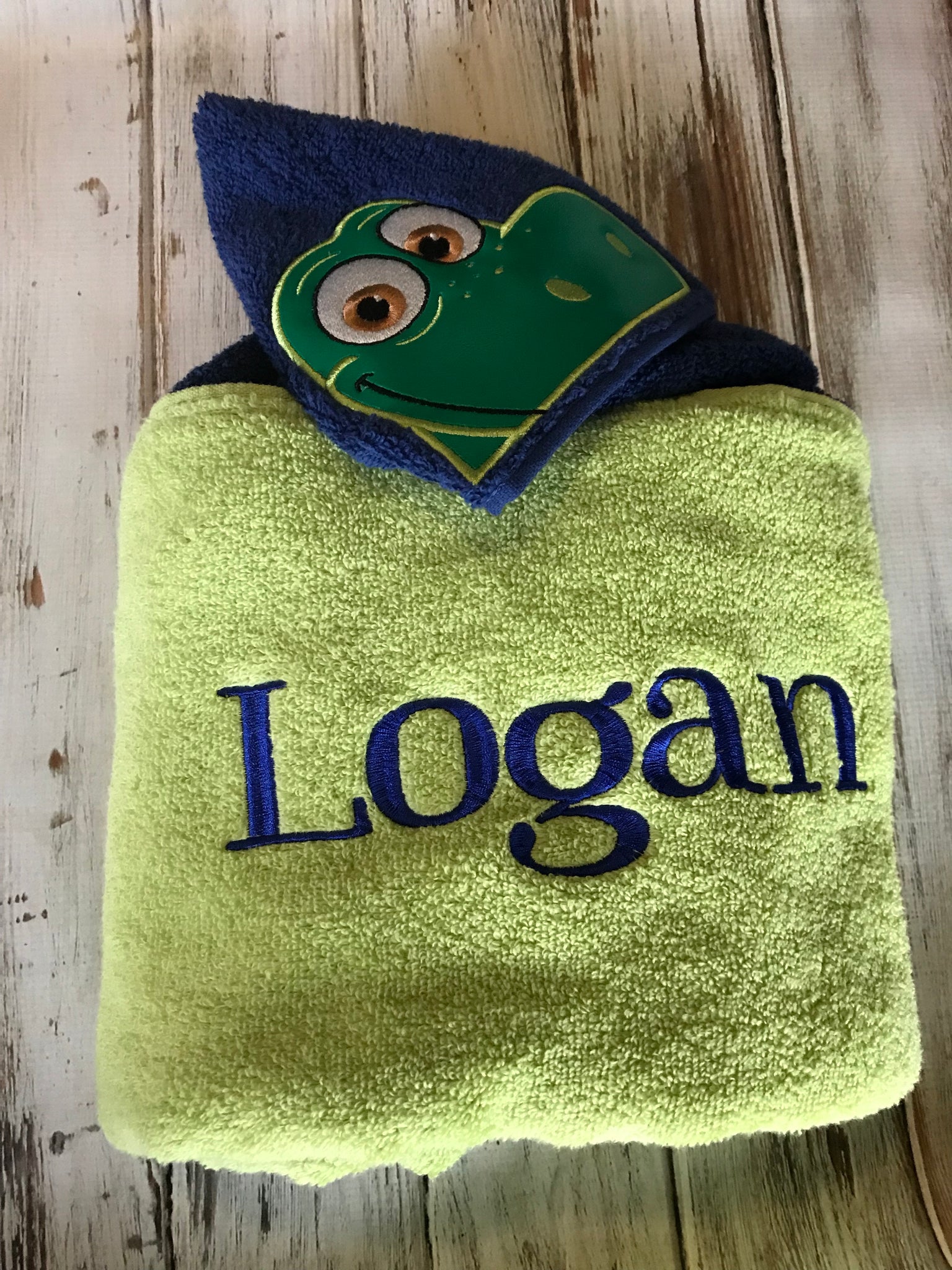 This listing is for a custom Aldo The Good Dinosaur hooded towel. Price includes child's name on the back of the towel.