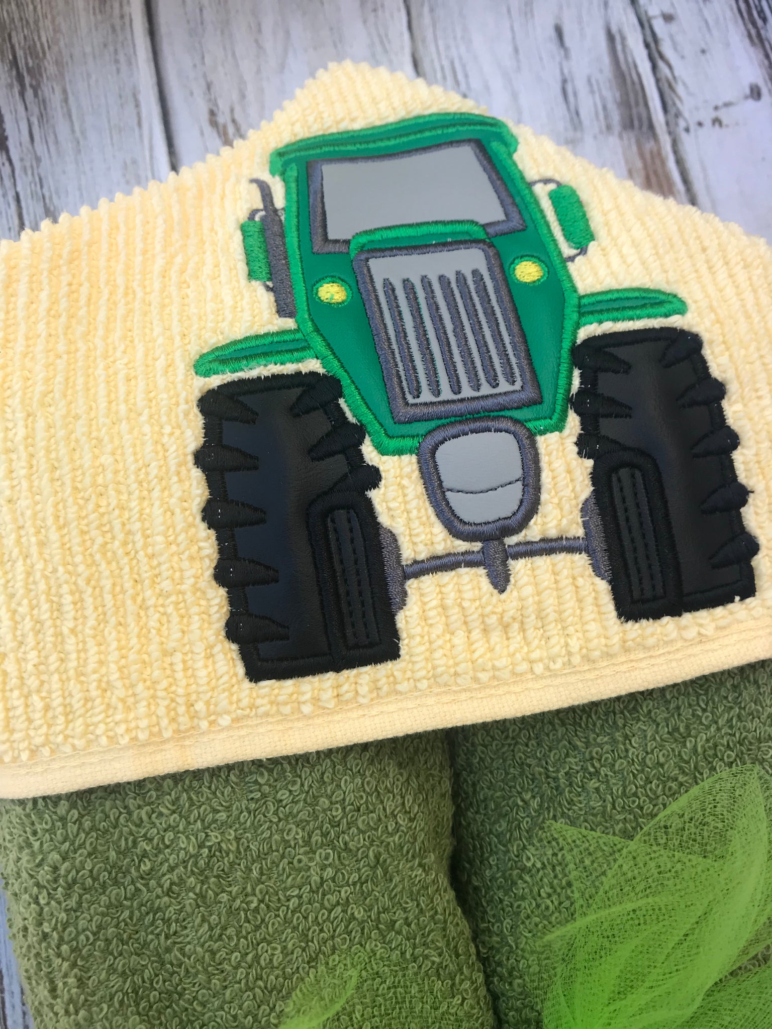 This listing is for a custom John Deer Tractor hooded towel. Price includes child's name on the back of the towel.