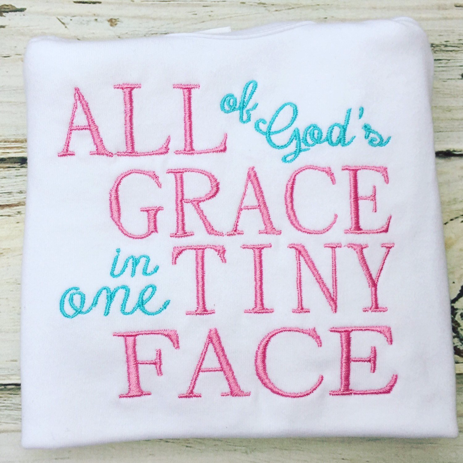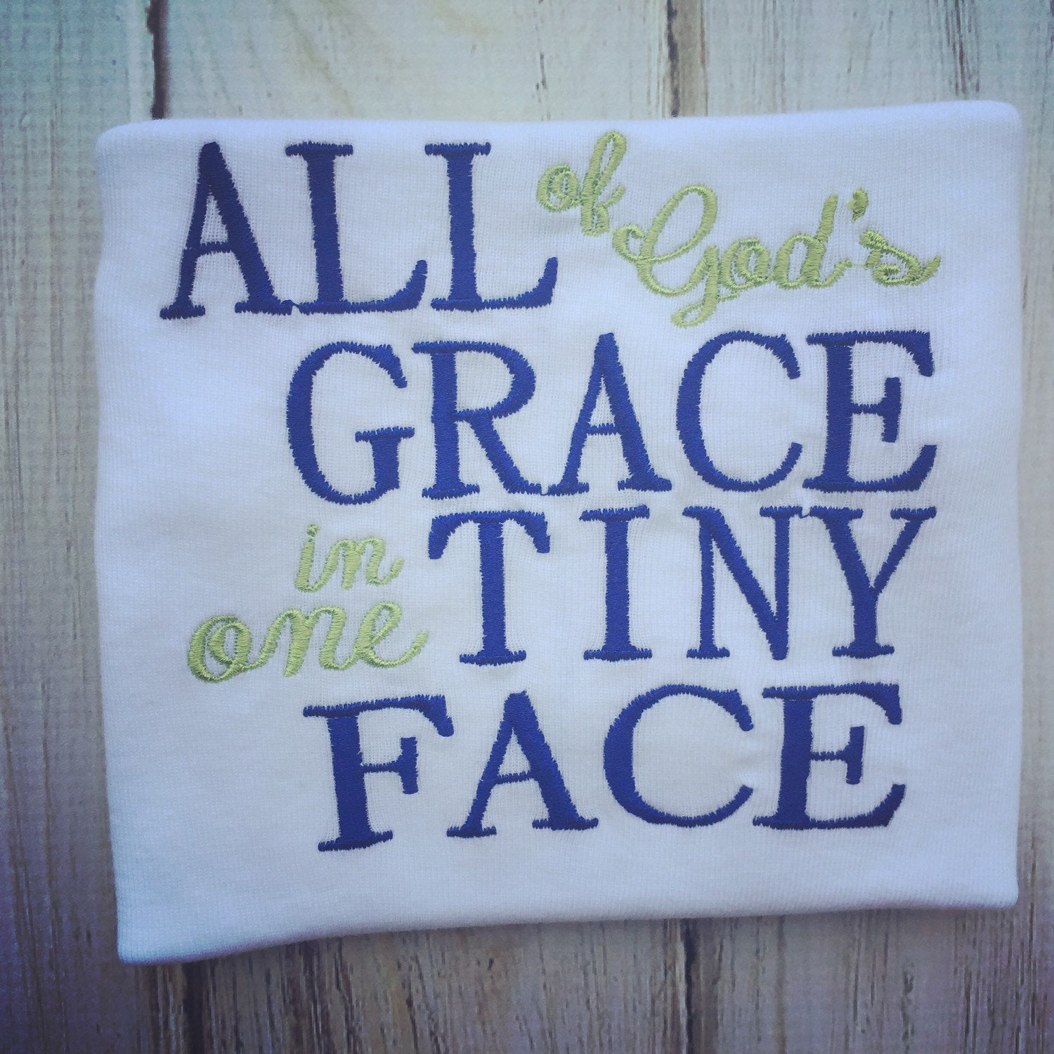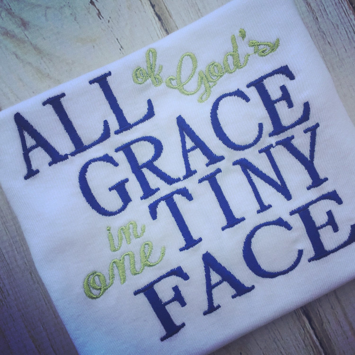 This listing is for a " All Gods Grace in One Tiny face ". You can choose to have it made on an adorable infant 0-3 month size gown or a onesie in your choice of size.