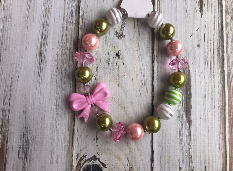 This listing is for an adorable chunky bead necklace in the colors Pink and green with some white in it as well. Perfect for birthdays, photo session, holidays or any day!