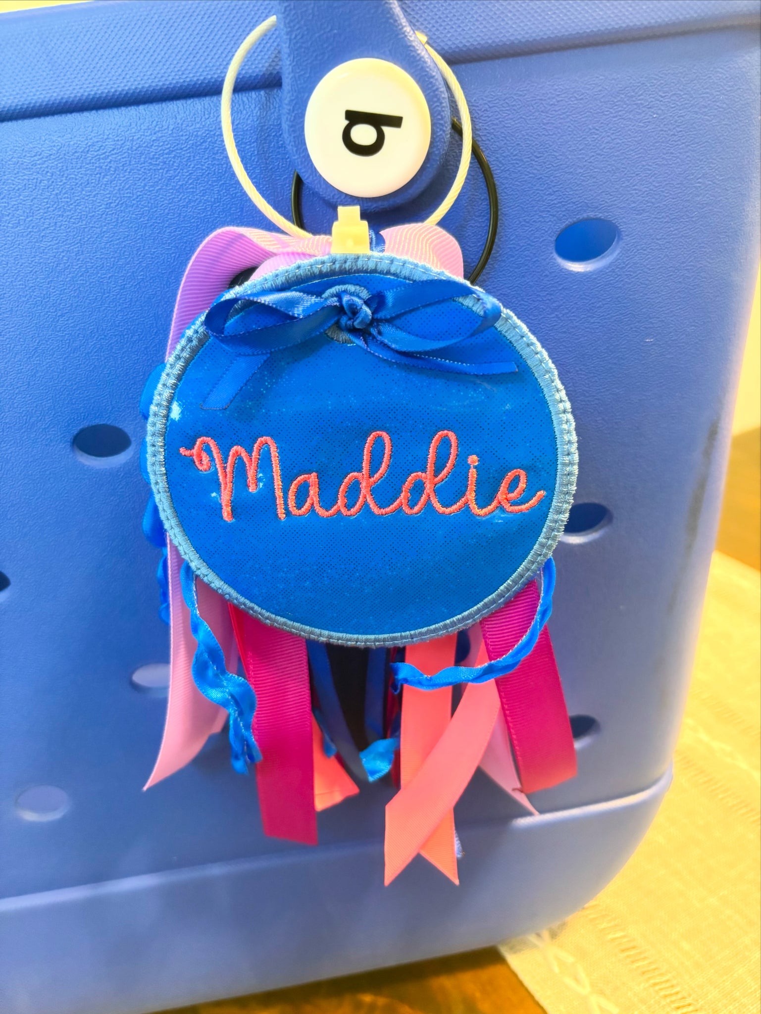 You choose colors for bag tag and name or word to be added. ALL bag tags come with ring to attach to bag.