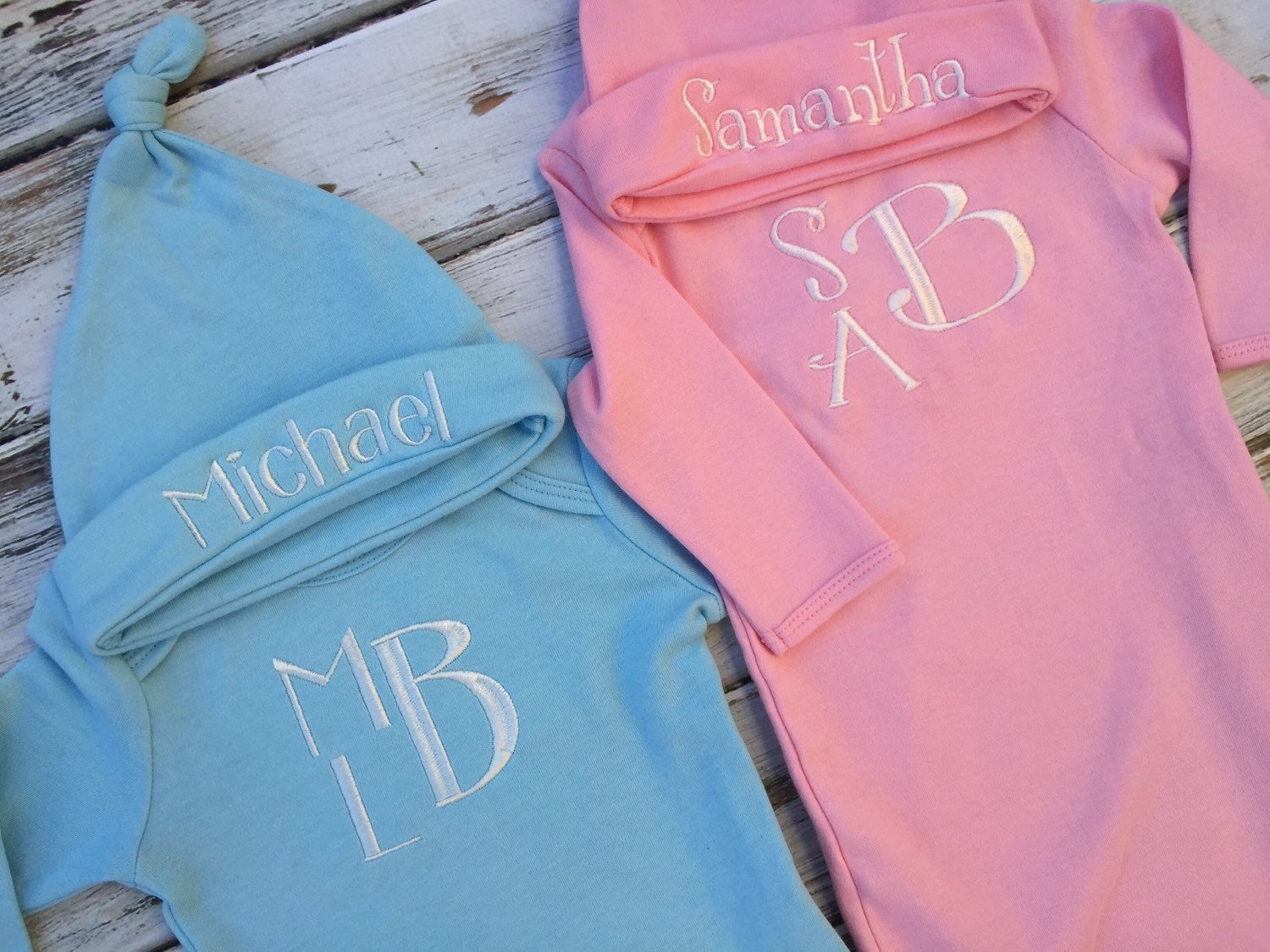 These gowns are 0-3 month, with matching infant knotted hat with your choice of monogram.